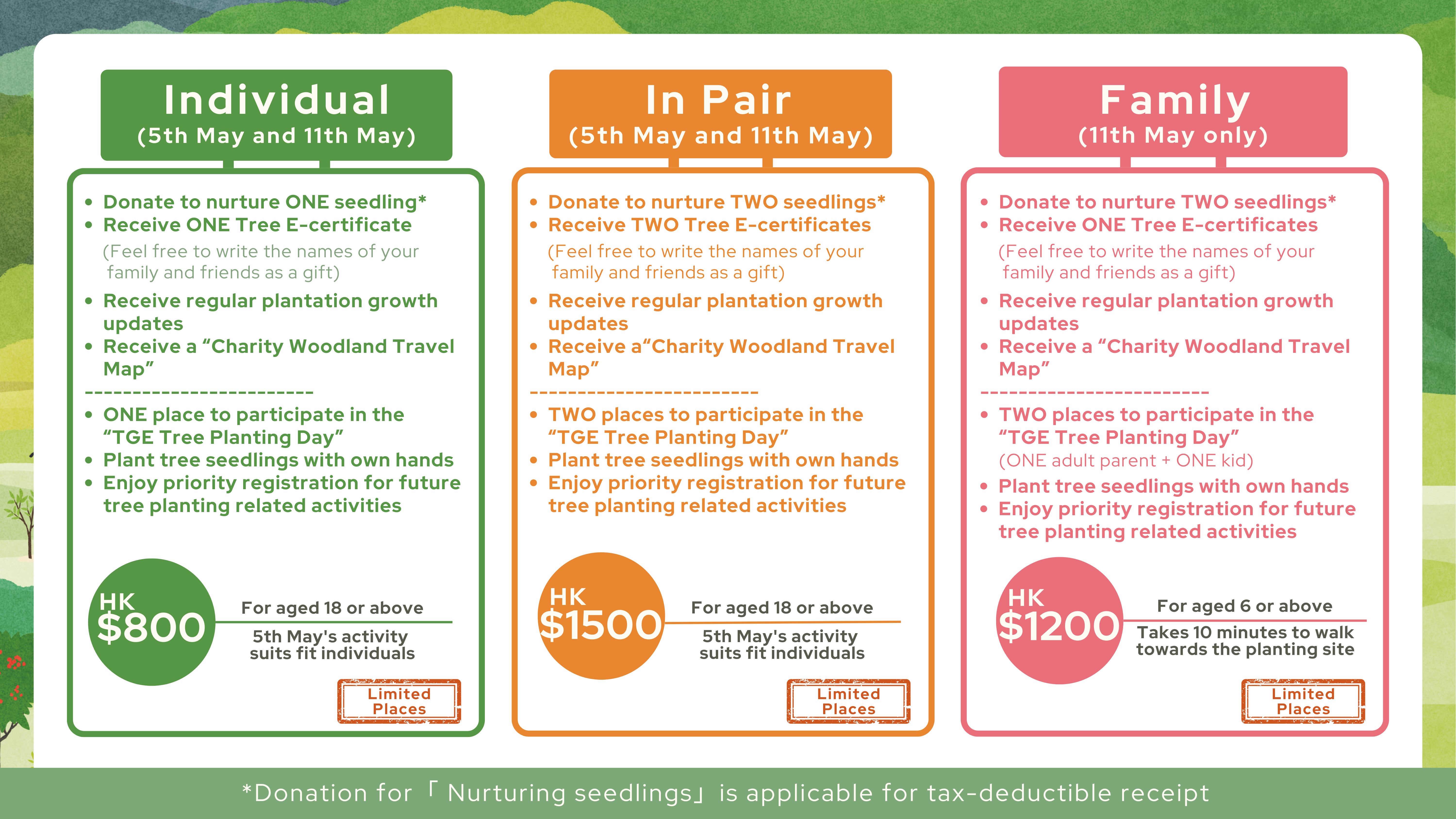 - Family: HK$1,200^ (Donation of HK$1,000 (to nurture 2 local native seedlings) + Activity fee of HK$200 (for two persons participating in the TGE Tree Planting Day, including 1 adult parent and one kid aged 6-17))