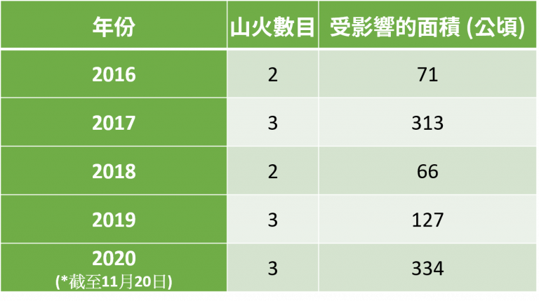 From 2016 to 2020*, the numbers of hill fires occurring in or threatening country parks in the Kai Kung Leng area of Lam Tsuen Country Park were as follows: