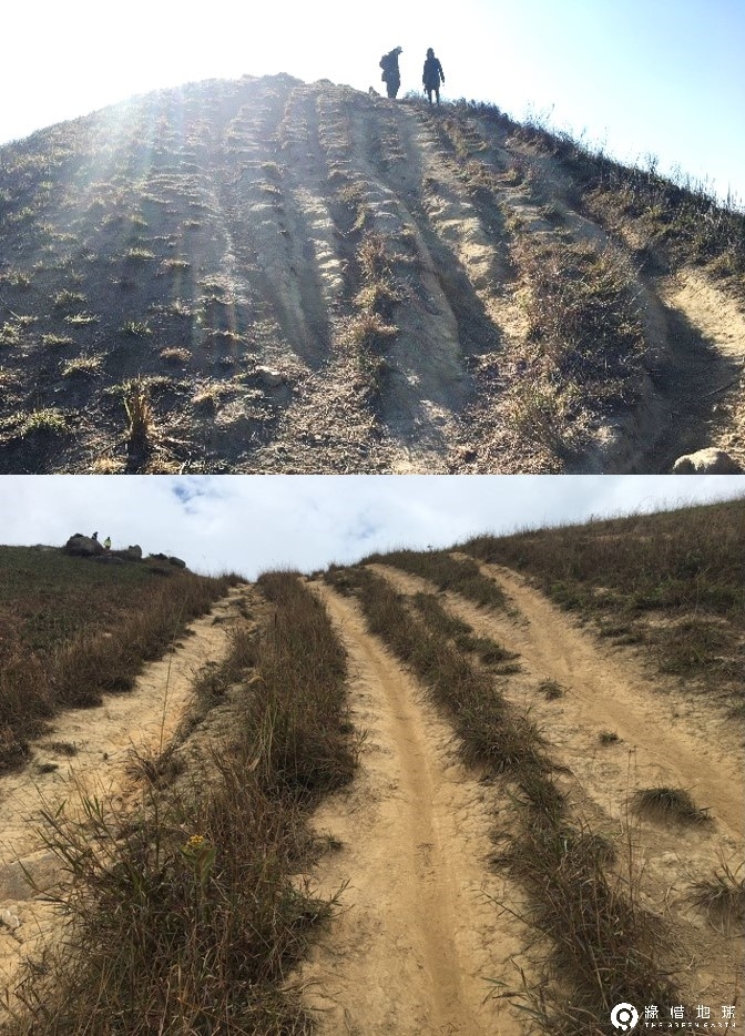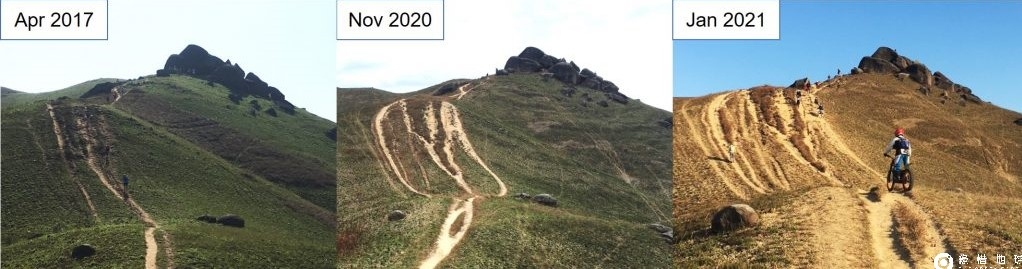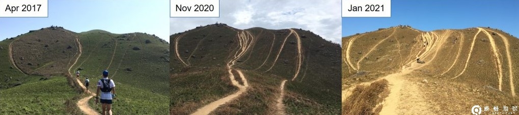 “Linear depletions (tire scars) can spread out into a network and merge into larger areas of disturbance, creating large scars on the landscape.” “If the land is gently sloped with a small scale of grass depletion, there is a chance for natural restoration. However, if it is a steep slope and the soil damage has reached to the mineral layer, it will trigger an irreversible process of land degradation that would continue even after the trampling — whether by people or vehicles — is stopped. In the present case of Kai Kung Leng, I think it is virtually impossible for the area to recover quickly without artificial restoration.” |