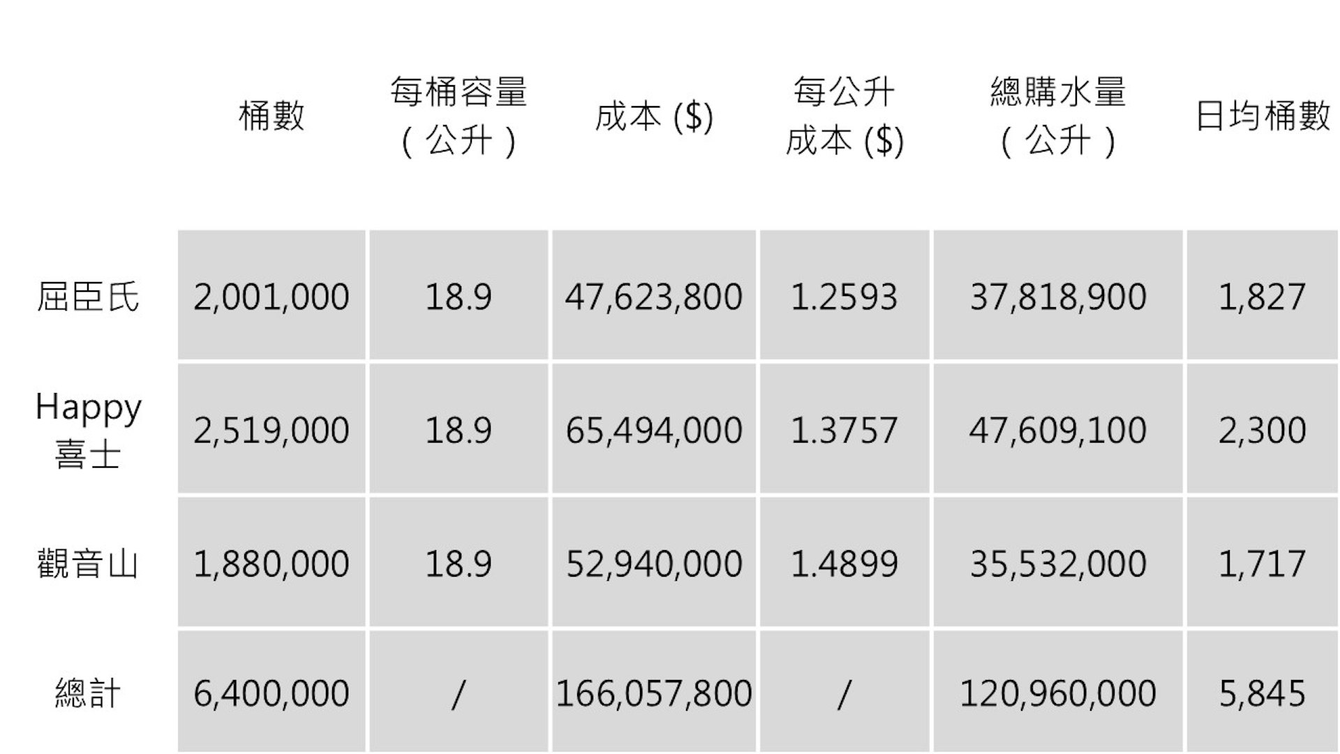 早前綠惜地球翻查政府的買水合約,三年向三間中標公司購買640萬桶水,共涉及1.66億元。其中備受關注的港島和離島區合約,購買量為平均每年62萬桶水,每年開資高達1,587萬。按每桶水容量劃一18.9公升(即5加侖)計算,平均每公升水的成本高達1.49元。