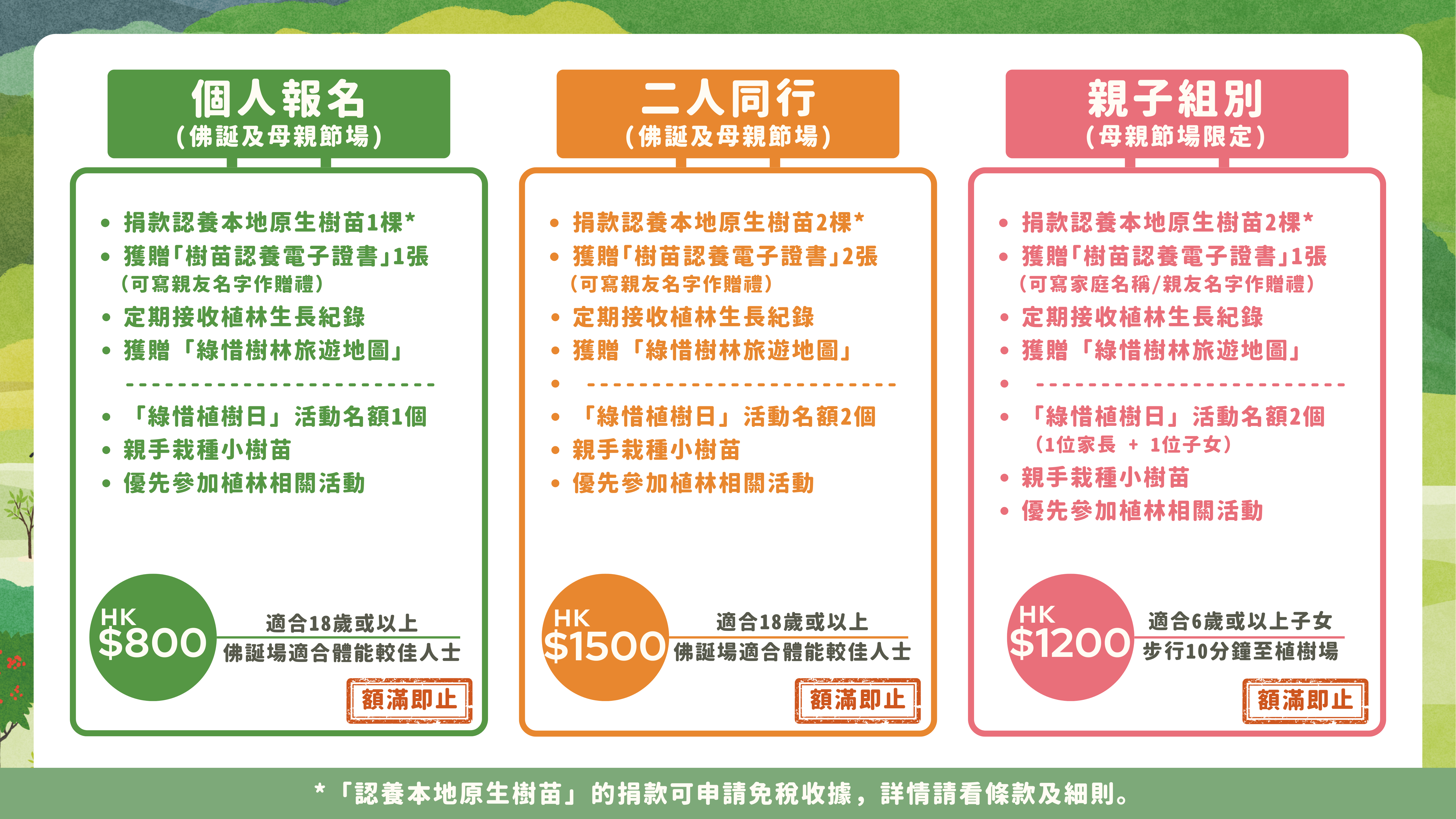 - 親子組別:HK$1,200(捐款 HK$1,000(認養 2 棵本地原生樹苗)+ 活動費 HK$200*(參加「綠惜植樹日」家長名額 1 個和介乎 6-17 歲的子女名額 1 個))
