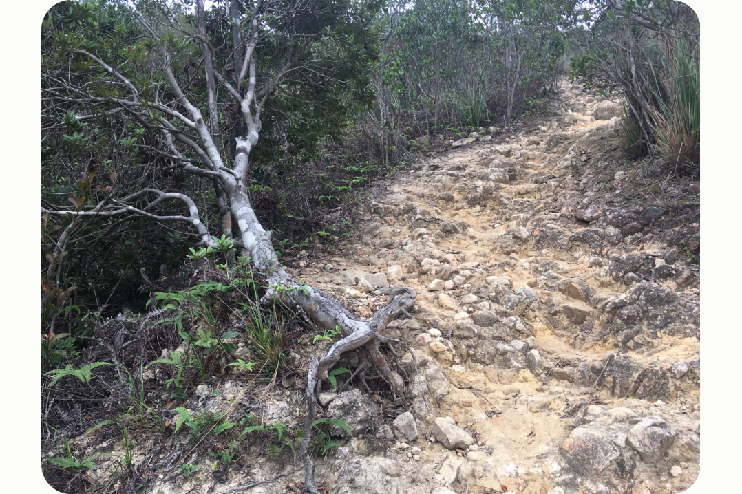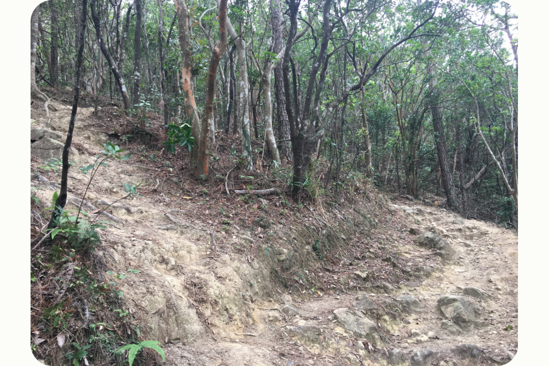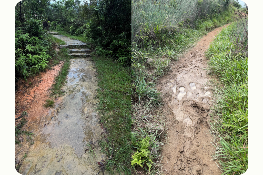 Due to waterlogging, muddy conditions or “not wanting to walk on concrete steps”, walkers may choose to walk on vegetation or dirt next to the original path. The result is a widening of the trail. As soil erosion occurs at the sides and walking becomes more difficult, people will tend to walk further away from the original path. Over time, the path gradually turns into a sandy and muddy avenue that is no longer green.