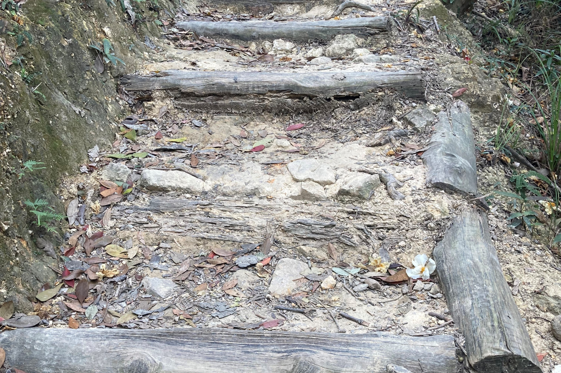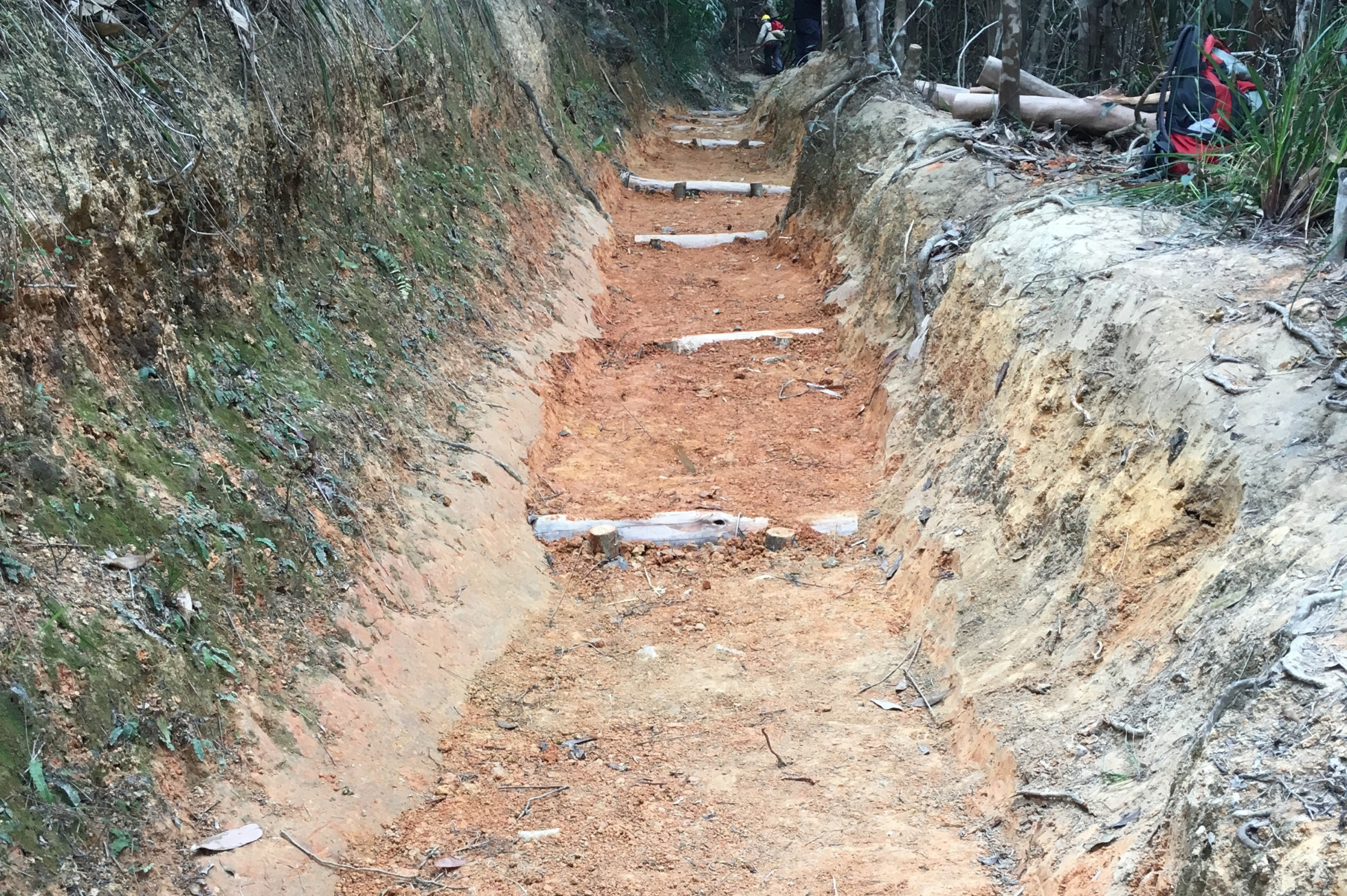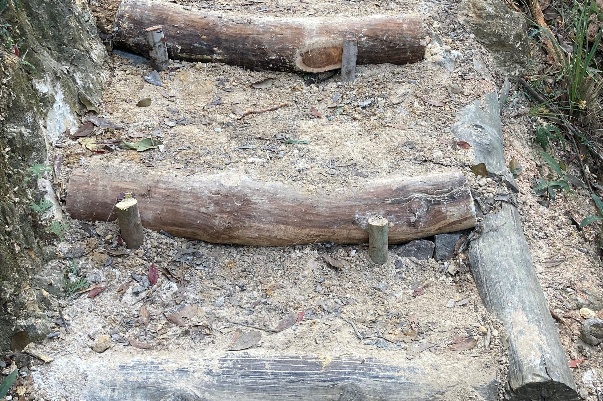 於是,一班山徑義工就在漁護署師傅及台灣千里步道協會團隊帶領下,協助修整紫崗橋一段山徑,利用橫木將深坑築成一條安全、易行的天然山徑。