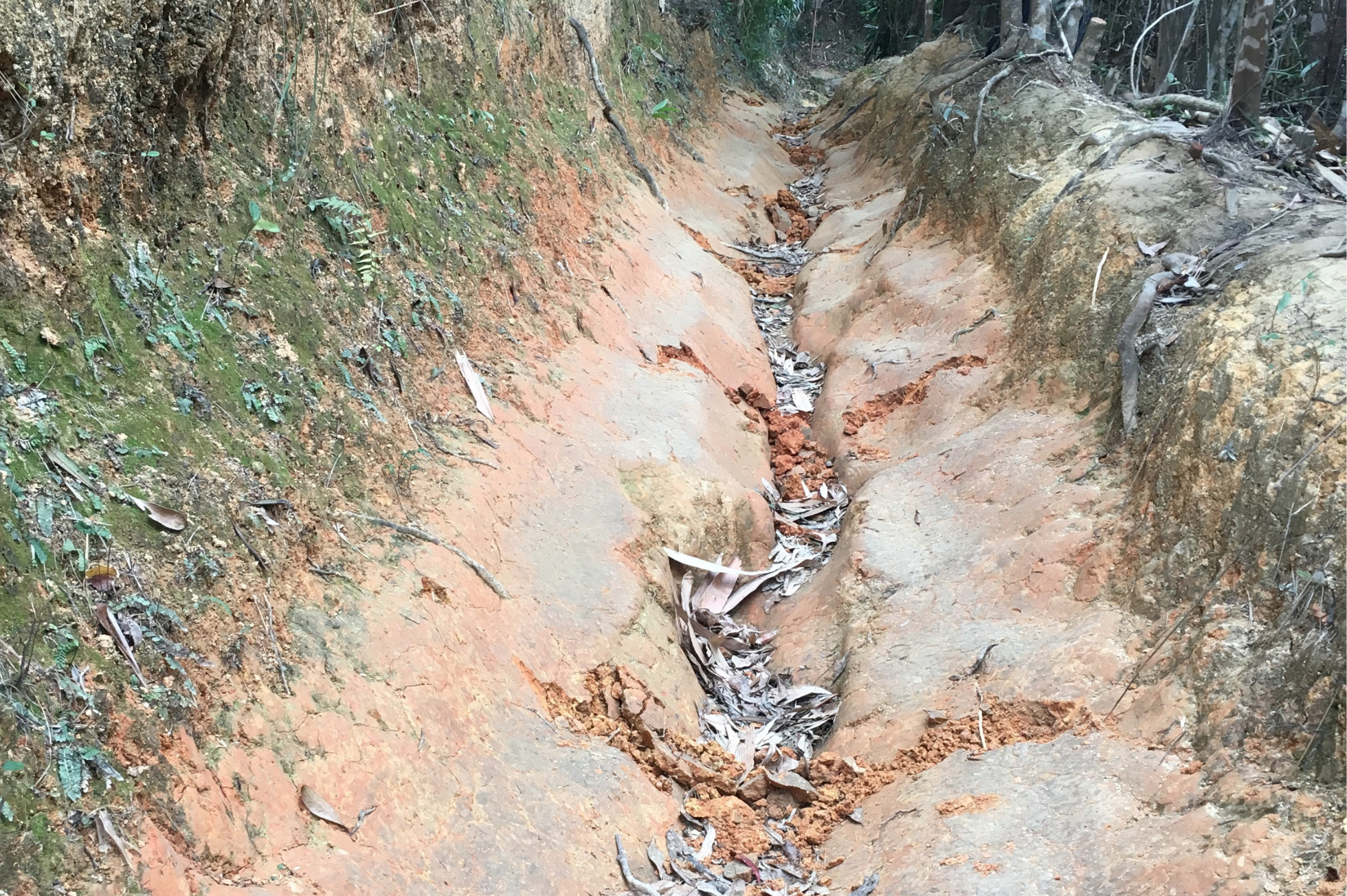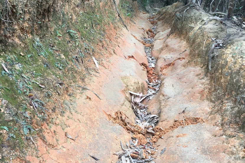 位於大潭郊野公園的紫崗橋,隨著山徑使用密度增高,加上山徑持續被雨水沖刷,山徑由平整的泥路,變成一條向下凹成 V 字的沖坑,行山人士只能沿著沖坑兩旁的「斜面」緩緩前行,在潮濕天氣下特別濕滑,甚為狼狽。